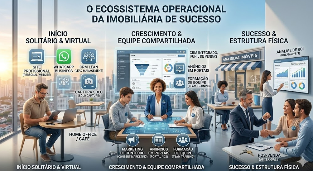 Total estimado: R$ 20.000 a R$ 60.000 para uma imobiliária pequena a médio porte iniciando com estrutura física. Para modelo 100% virtual, reduz bastante (de R$ 8.000 a R$ 15.000).